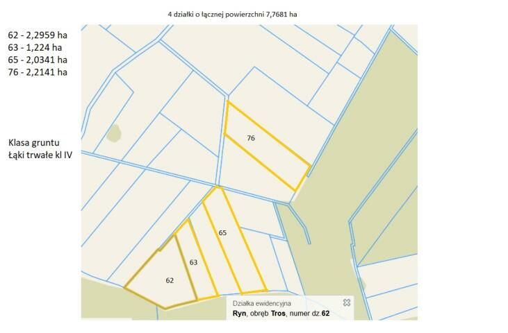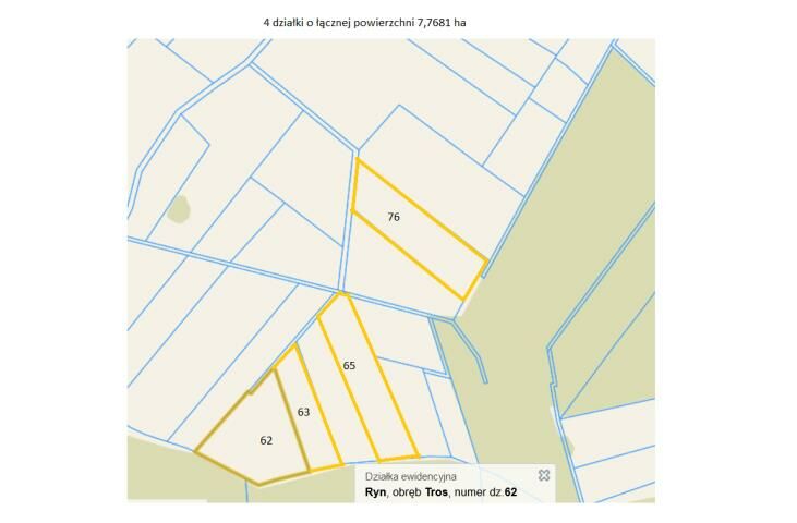 Grunty składają się z 4 działek o numerach geodezyjnych: 62, 63, 65 i 76.